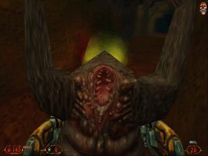 The monsters give the impression that the developers wanted to see how the original game would have looked if designed by people with no imagination whatsoever: generic zombies, generic suited henchmen, and “Blandcraftian” alien creatures that defy description for all the wrong reasons. The monsters in Blood were generic at a glance, but they had character and detail that made them memorable: bulging Evil Dead eyes, horridly distinct voices, and sharp, hideous features. Blood II‘s monsters seem like they belong in a different game altogether, perhaps a generic Unreal ripoff or a bad horror game endorsed by Clive Barker… and they never, ever shut up, constantly spouting their one or two taunt phrases until you eventually kill them (or yourself). Blood‘s phantasm monster was annoying due to its constant, shrill shrieking; here, everything is trying to annoy you to death, even the helpless pedestrians who beg at a rate of twice per second!