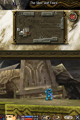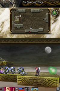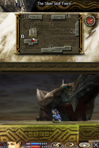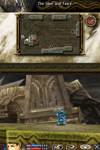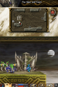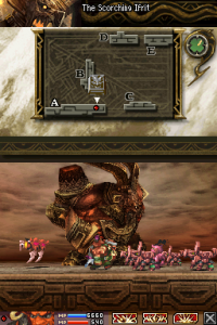Blood of Bahamut is split into missions, which end with cutscenes containing story or interactions between characters. The top screen displays the map of the stage, the position of both our character and the Behemoth they’re facing, as well has the health bar of the Behemoth and any companions. The bottom screen shows the character’s health, MP, and equipped abilities. You can move your troops by using the D-pad along with the shoulder buttons or the stylus, and attacking enemies is done by tapping to target an enemy. To use abilities, you touch their icon to select them, and touch an enemy if they are offensive, or touch it a second time if it’s supportive.