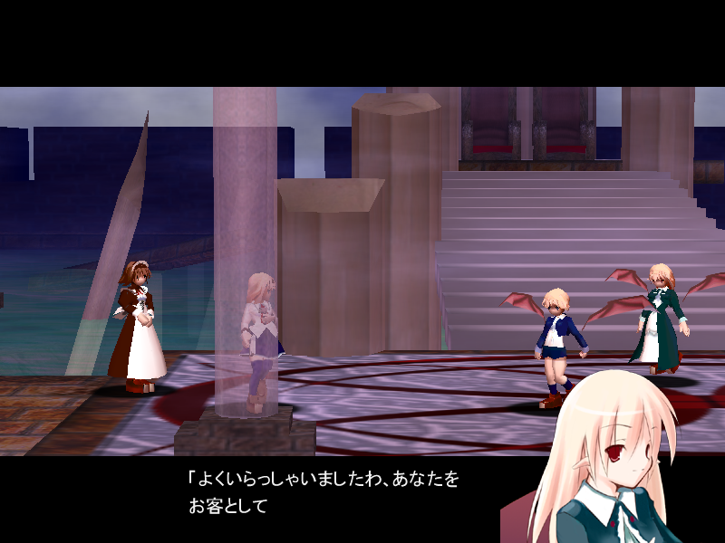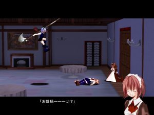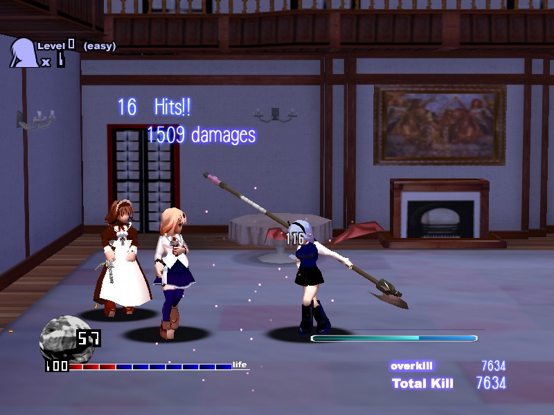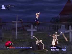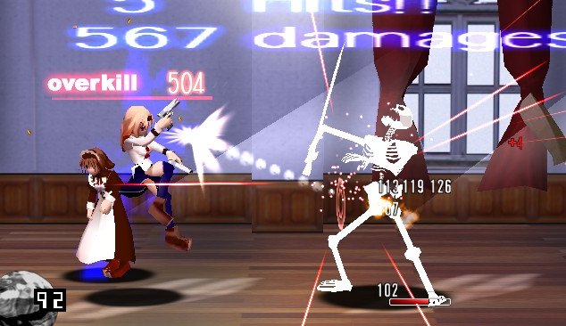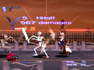 Anyway, in Blood-over-, you control a girl named Shou, a “Free Hunter” who, like Dante, wields a pair of duel pistols. She’s also accompanied by a maid named Akari, who litters the round with her gatling gun whenever your super gauge (called “Blood” here) is high enough, but otherwise just follows along and yells “oneesama!” a lot, as anime maids are prone to doing. When attacking with your guns, it autotargets the nearest enemies, although you hold down the target lock button to keep firing a specific foe. Shou also has two primary kick attacks – a quick, standing kick and a more powerful thrusting kick. Using command motions, you can execute a few special attacks, like a Guile-esque somersault kick and a super bullet attacks. You can also launch enemies in the air and then proceed to juggle them by ducking and shooting. In addition to the Akari gatling attacks, there are two other special moves which consume special energy. You jump by pressing Up, though a separate button would’ve been nice.