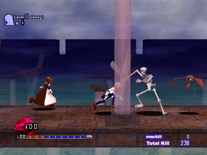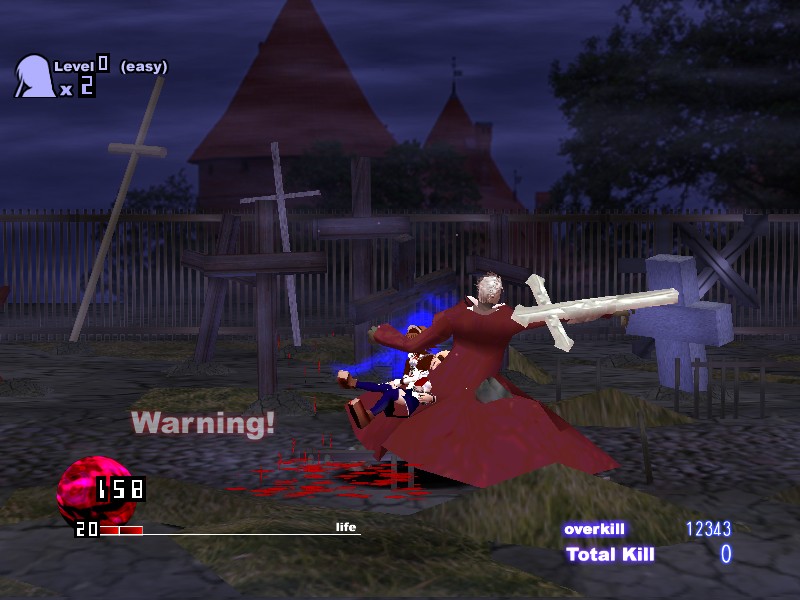 Blood-over- utilizes full 3D graphics for both the characters and backgrounds. The human character models are well animated, even though they’re severely lacking in details. Most of the enemies are pretty lousy though, which is made particularly apparent seeing as there’s only a couple different monster types throughout the entire game. The system requirements are pretty low – Pentium 3 1 gHZ and a video card with 32 MB of RAM – but the speed is pretty erratic on my computer, slowing down immensely as more foes clutter the screen. All of the stages are straight lines right to the end, with repetitive backgrounds that only change when you reach the boss. You can run by straight past most of the bad guys, although there’s usually a midboss or some kind of stopping point where you need to clear the screen before you continue. The rock soundtrack is catchy and well-composed, but really suffers from the cheap MIDI synth used to record it. With better quality samples – or even real instruments – it’d actually be pretty remarkable. The title screen song – which has lyrics – is pretty cool, at least. There’s also full voice acting in the cutscenes.