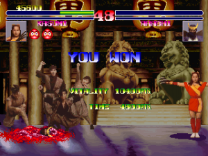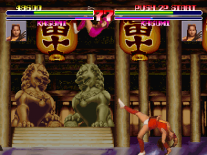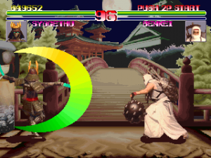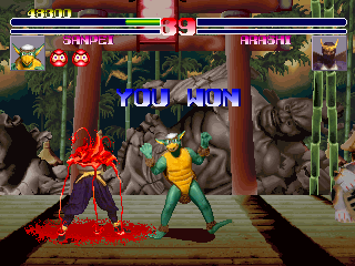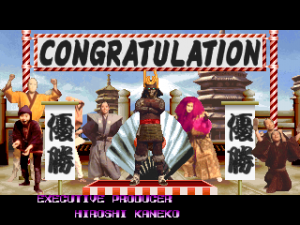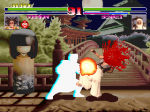 The game also lacks personality, even with all of the new voice overs and character designs. It doesn’t quite gel together aesthetically because of the workmanlike backgrounds and, like Shogun Warriors, the total lack of context for any of the characters. In both games there are no triumphant or humorous quotes from the fighters after a battle, and while Shogun Warriors‘ ending is so short it may as well not even be there, Blood Warrior takes this to its logical conclusion and has none. After defeating the other combatants, you only get to see your character standing on a podium surrounded by some of the developers as the credits roll by. There isn’t even a boss fight at the end. For a game mostly meant to be played by two people fighting each other, these aren’t terrible omissions, but are part of why this series was quickly forgotten compared to games of its time with superior character designs and more focused art direction.