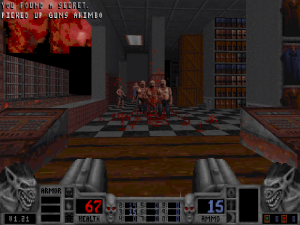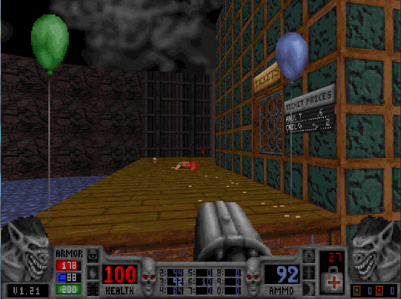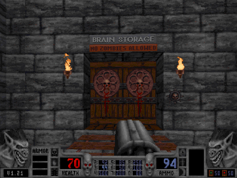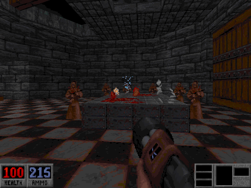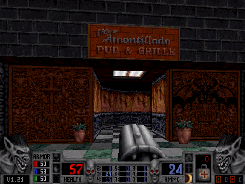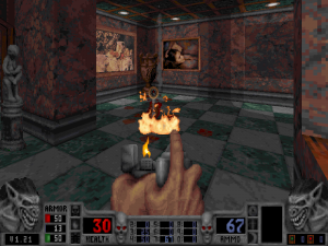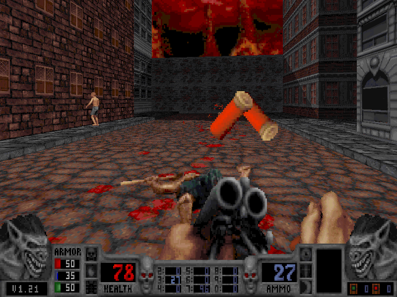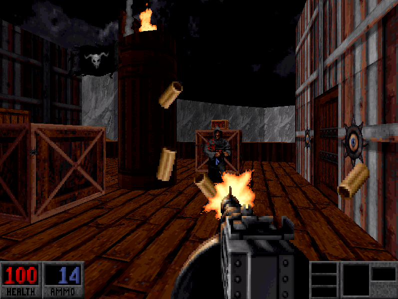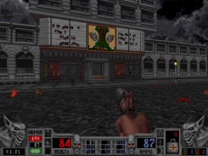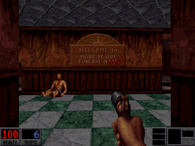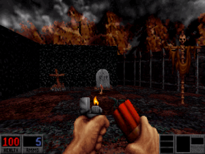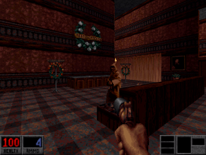 Ahh, the Build Engine – the most prevalent game engine of the nineties, created by Ken Silverman. Blood was the last commercially released shooter to use this engine, which also gave birth to Powerslave, Duke Nukem 3D, Shadow Warrior, TekWar, Witchaven, and a score of other shooters – obscure, unreleased, or otherwise. Each game further refined the engine and its atmospheric effects, with Shadow Warrior allowing the player to pilot forklifts and tanks built out of sector objects. Blood features no drivable vehicles (there are a few instances of riding in a dinghy or a mine cart), but it perfected the art of Build Engine atmosphere, with zombies burrowing through walls to get at the player, fighter planes carpet-bombing city streets, doors and other devices with a host of complex moving parts, and sprawling, highly detailed maps that better convey real-world locations than any of its predecessors. The player shoots it out in every conceivable location: a moving train, an opera house, a supermarket, a haunted hotel, a haunted mansion, a hospital, a hedge maze, a demonic cathedral, a pirate ship, icy caverns, and the innards of a colossal, living creature just to name a few… all of which are an absolute delight to remodel with bombs and bullets. And there are secrets (and booby traps) absolutely everywhere, just waiting to be discovered.