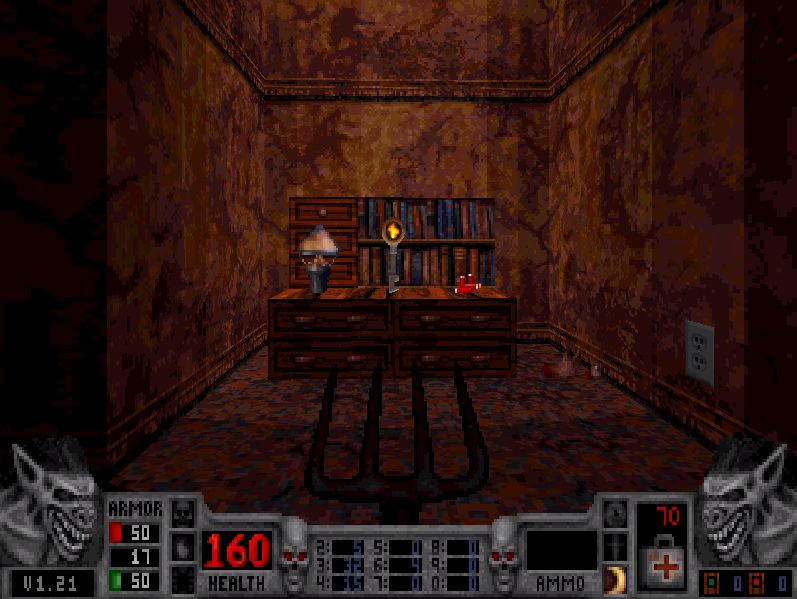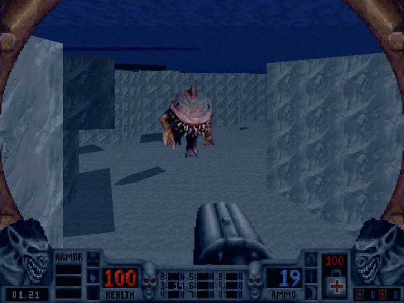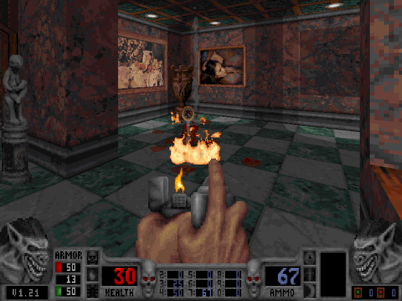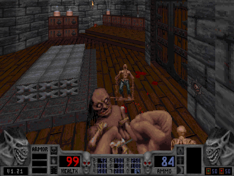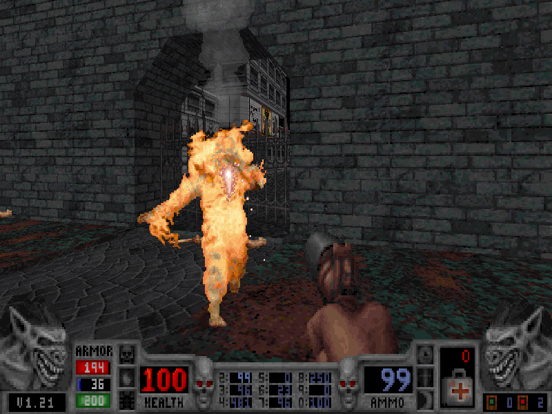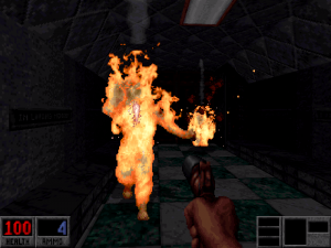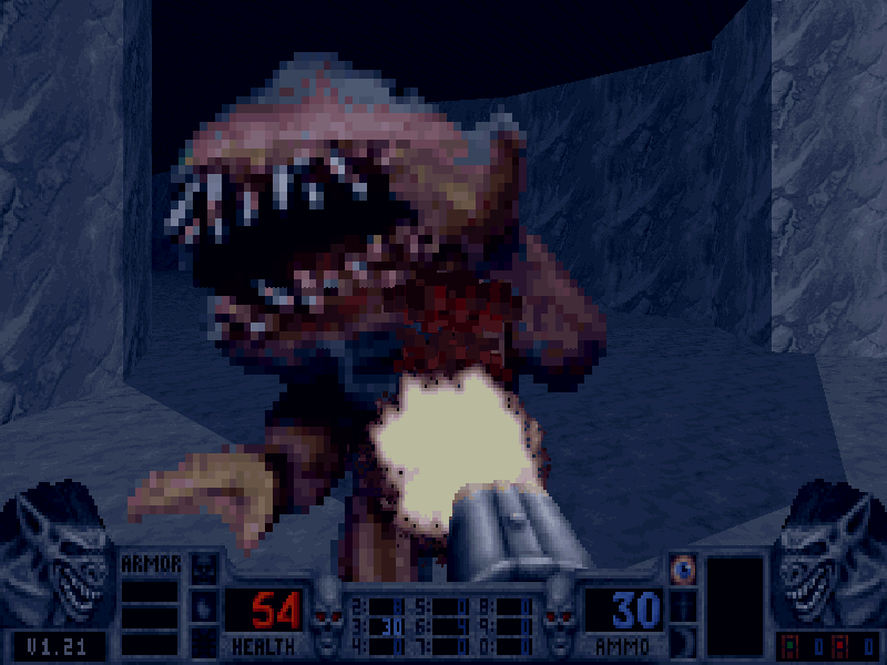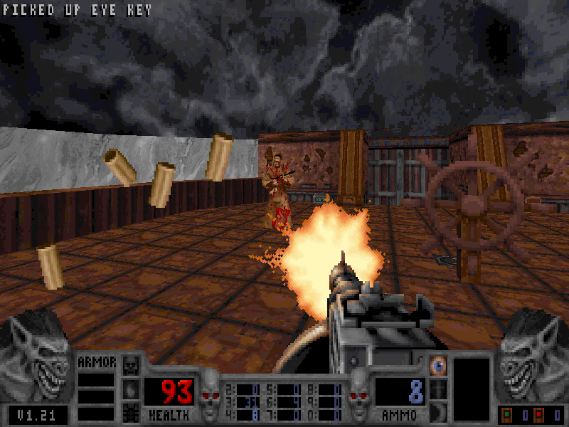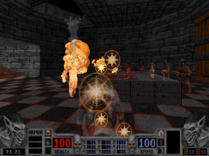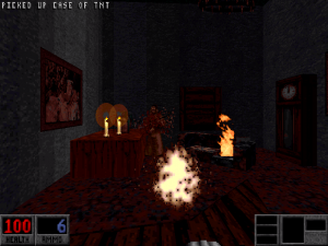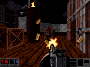 It’s not without the Build Engine’s quirks, however, such as “sector clipping” issues where a bomb blast occasionally affects any monsters standing on a table, but not around the table; or a harmless-looking door crushing Caleb to a pulp when it closes on him. The full status bar often suffers from display glitches such as general flickering, spazzing numbers, and unchanging ammo and health values – for some reason the smaller bar doesn’t do this.