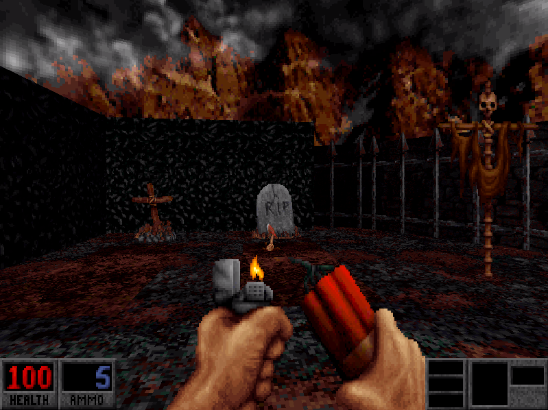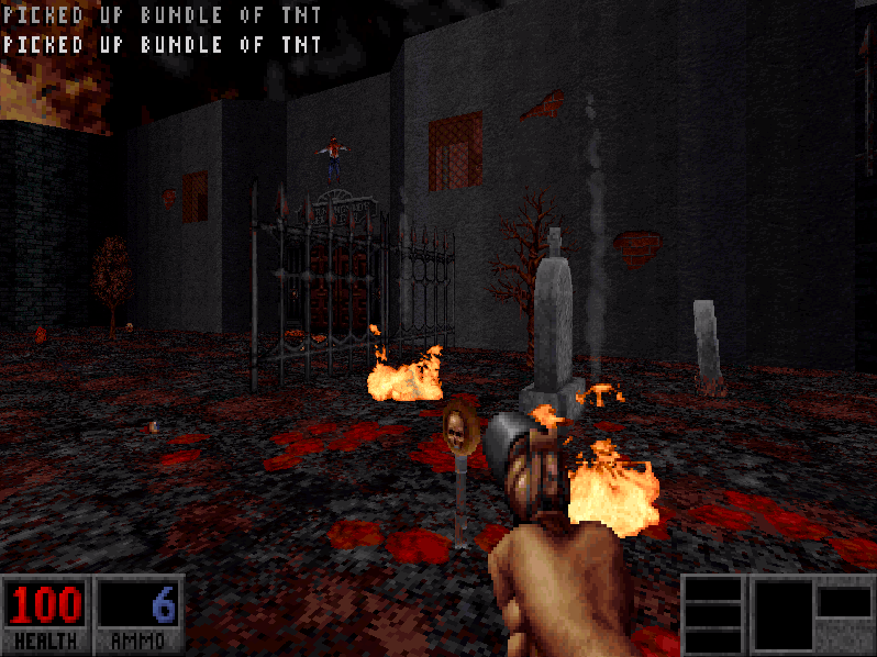 Blood is often celebrated for its unusual arsenal of weapons, which takes a refreshing break from the standard fare of other shooters from the same era. Foregoing the stale lineup of fist-pistol-shotgun-chaingun-rockets, Caleb’s arsenal instead showcases what a resourceful badass he is: set monsters on fire with a flare pistol or aerosol can and watch them flail and scream in the street; blast them in half with a sawed-off shotgun or a Tommy gun; give them inexplicable eye pain with a voodoo doll; even jab ’em fulla holes with a pitchfork! Best of all are the plentiful dynamite bundles, which can be used in so many fun and creative ways that you nearly weep when you run out of them: light the wick and toss them around a corner or onto an enemy’s head, place them with a proximity switch wherever you expect an ambush, or set them off whenever you want with a remote detonator. Nearly every weapon has a normal and alternate fire mode to maximize your destructive pleasure.
