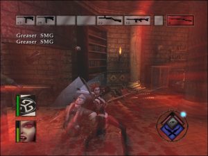 Terminal Reality was a Texas-based studio who had some success with a PC horror game called Nocturne. Having partnered up with their new publisher Majesco, they reworked their initial plans for a sequel to Nocturne into something more mainstream-oriented. The new lead was a half-vampire like Svetlana from their previous game, but Rayne is a modern action hero type with a strong focus on sex appeal, whereas the Spookhouse agent had a more classic, Lugosian approach to her character. If Nocturne was a 1930’s pulp novel serial, BloodRayne would be the modern comic book or action flic; glossy, colorful, violent and sexy. Born of a time where entertainment media started to aggressively borrow each other’s aesthetics, stylistic means, BloodRayne’s professed role models where the Matrix and Blade movies, both of which themselves drew heavily from comic books and video games (not surprising in the case of Blade, which was in fact based on a Marvel character).