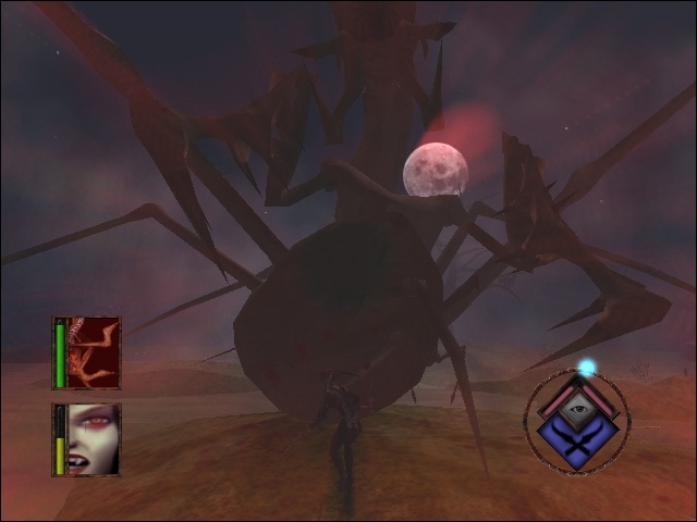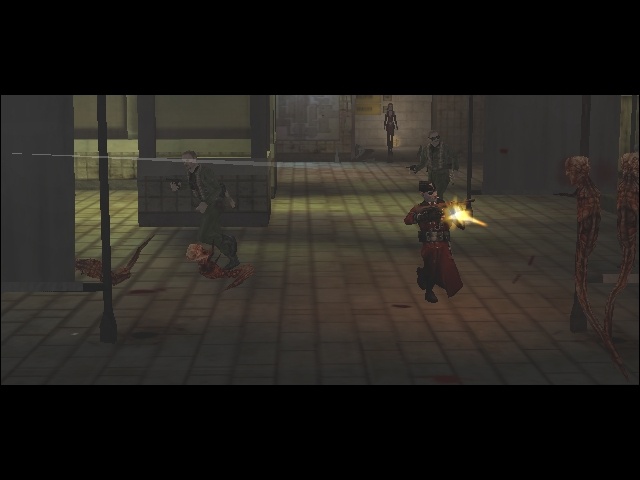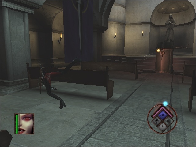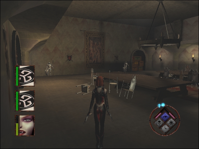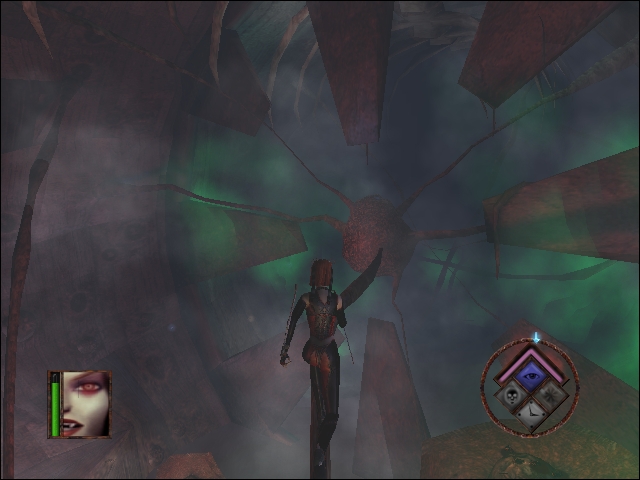 A low polygon count, the somewhat blocky architecture that goes with it, and the occasional low quality texture might make BloodRayne look outdated now. At the time of its release, however, it was a fairly good-looking game. Effects like animated cloth (though not given as much spotlight as in Nocturne), colored fog and the different filters for visual powers were still fresh and uncommon enough to make the graphics stand out. The stages also hold a lot of destructible objects, some boss rooms in particular are set up so they get trashed completely during the fight. (One of them very much reminds of the famous foyer scene in the first Matrix movie).