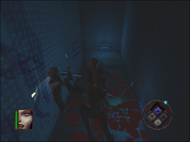 Besides vampiric healing and super high jumping ability, most special powers alter perception. Aura Sense is kind of a infrared-like vision, which highlights living creature according to the strength of their life signs, but also current objectives, as unscientific that might sound. Dilated Perception slows down every movement – this was the time when game designers just had adopted bullet time from The Matrix and the feature saw much (over)use – which is essential to get behind blocking enemies, get some orientation over the otherwise insanely fast gameplay and of course dodge bullets. Extruded View finally is a glorified sniper mode and the least viable, for combat is almost always intense and more often than not takes place in close quarters.