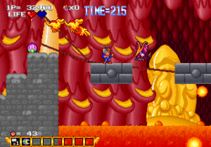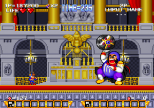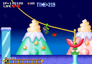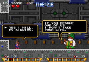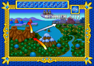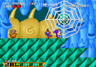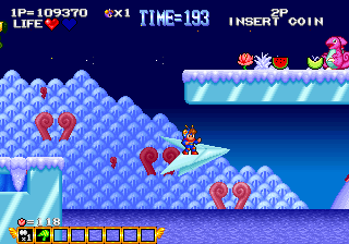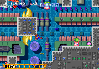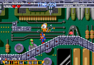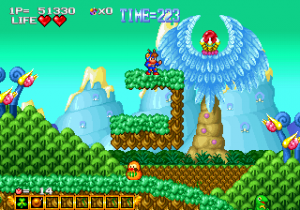 Aesthetically the art is cartoony, jovial and charming but the truly impressive aspect of the presentation is the utilization of design to propel and add profundity to a story without the use of exposition. The game needn’t tell the players the vast effects of the Daruma Tribe’s pollution, as the art provides compelling evidence. Toward the conclusion, in the aptly titled Mechanical City, whole sections of Raguy have been invaded by the Daruma tribe and in wake of an abundantly green woodland, they’ve constructed a lifeless, computerized metropolis. The increasingly melancholic visual implications of Daruma’s reign, contrasted with the otherwise colorful and cheerful artstyle, adds credence and gravity to Blue’s escapade across Raguy. It should be noted that while the quality of the art is excellent, the sprites are rather small, a rather noticeable departure from other Neo Geo games, which often prided itself on its gigantic characters.