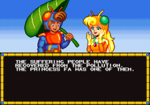 Blue’s Journey takes place on the planet of Raguy. Originally teeming with flora, the Daruma tribe invaded Raguy in order to pollute it, in an attempt to bring forth its people’s demise. Blue, seemingly otherwise unfazed by the prospect of an impending mass planetary genocide, was asked by Princess Fa to expunge the threat of the Daruma tribe. Via an impromptu decision fueled by gratuitous masculinity and love, Blue sets out to save his planet. Despite its resemblance to an episode of Captain Planet, the story exists mainly to justify the vivacious artwork.