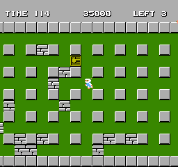 Perhaps in an attempt to further sweepBakudanOtoko under the rug, Bomberman was ported back to the MSX in 1986 as Bomberman Special. It’s mostly the same game, but with some compromises made to accommodate the MSX hardware. Enemies have less animation, levels are now broken up into distinct segments instead of scrolling smoothly, and the game in general is a bit slower. Everything is a different color in this version, primarily using a somewhat garish combination of blue, green, and gray. Beyond these changes, all of the features of the Famicom game are present here, making it a respectable port overall.