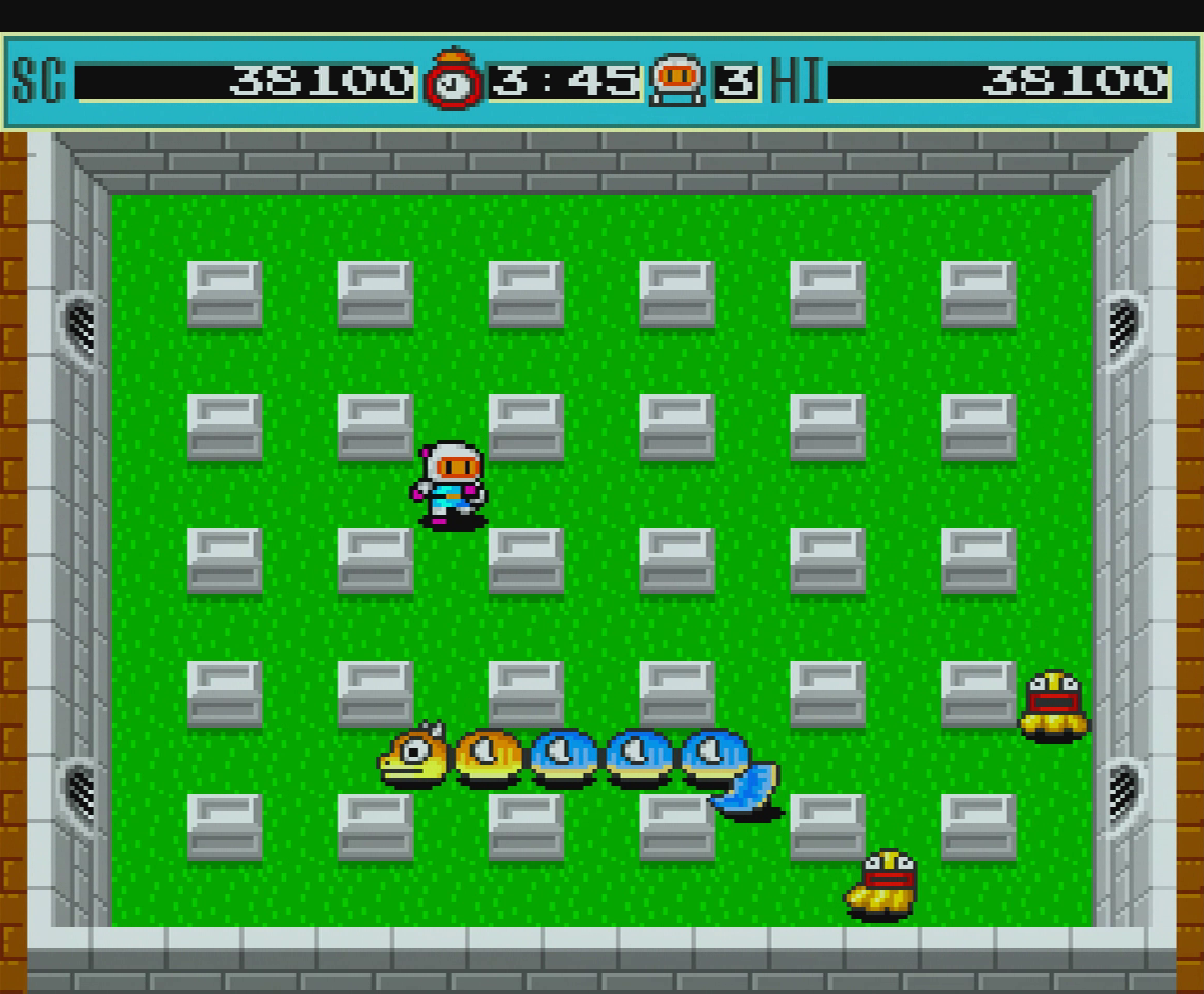 Perhaps the biggest addition to the single player here is the introduction of bosses, though the idea doesn’t feel fully realized. Boss fights present a slightly larger than normal foe, such as the worm Arion or Bubbles, a boss capable of producing smaller versions of itself, and simply ask you to blow them up in a maze bereft of soft blocks. The problem here is that most of the bosses just end up playing out like a room full of standard enemies. Bosses don’t aggressively pursue you and it’s not until late in the game that they get actual attacks, so it’s not hard to take them out quickly. The final boss is at least a highlight of the game – Black Bomberman takes you on alongside four other Bombermen (Green, Yellow, Red, and Blue), resulting in a scrappy, thrilling battle not unlike a rigged multiplayer match, befitting of Black Bomberman’s villainous position.