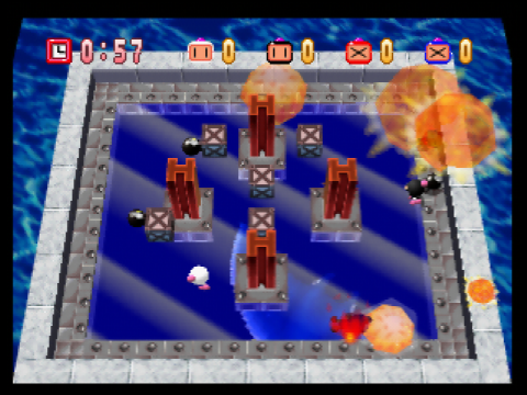 If you collect costume pieces in the main game (many of which are hidden in even nastier ways than the Gold Cards!), you can also customize the appearance of your Bomberman for multiplayer, allowing you to spice things up in goofy ways. All of your abilities from the story carry over, which makes the pace of this entry particularly blistering because everyone can throw and kick bombs as soon as a round starts. This is likely why critics were displeased with this incarnation of the multiplayer; instead of being a game that starts slow and crescendos in intensity as players get eliminated, Bomberman 64 prefers to enable chaos faster than ever before, encouraging you to end matches quickly by “playing dirty” and doing things like throwing your opponents off of stages or stunlocking them with a barrage of kicked/thrown bombs.