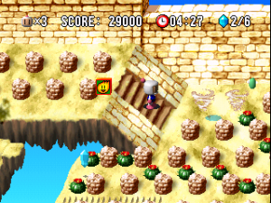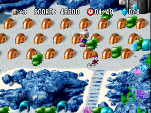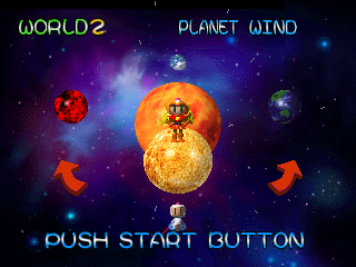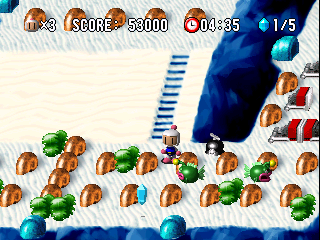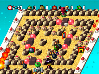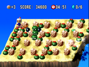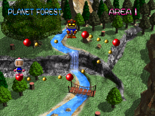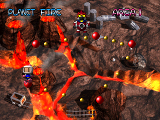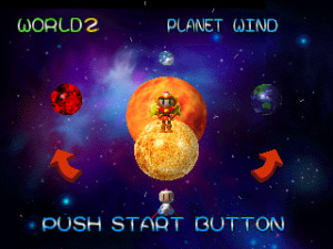 The single player story mode offers the standard suite of worlds and hazards. It begins with a simple forest planet that offers little of note besides trees that can be knocked down, cow heads that attempt to ram you, and monkeys who like to throw bananas at you. Planet Wind combines tornadoes with a desert theme and also introduces platforms that’ll carry you to other parts of a level. The fire planet is exactly what you’d expect from the series at this point with its volcanoes and minecarts. Planet #4 is a mostly simple water area, but it at least has a level where a crane will attempt to grab you and bring you back to the start of the level. Planet Black, the finale, uses a similar idea with magnetic satellites that’ll lift Bomberman up by his head. These levels are competent if a bit simple, but this game’s particularly short length betrays their potential. Since the boss fights take up two of the five levels that make up each planet, that only leaves three stages to attempt to express a planet’s themes.