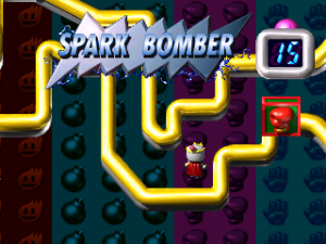Battle mode in this installment consists of almost entirely familiar elements, but the ones brought back are very much welcome. Each character has different habits when controlled by the CPU, much like Bomberman ‘94, Maniac mode from Super Bomberman 4 returns for some welcome flexibility, and options like Bad Bomber and battle groups are here as well. The biggest twist on the battle mode formula is the addition of a second battlefield to most of the maps. Players will either start on or can warp to a floating platform that moves back and forth above the upper half of the battlefield. This platform is extremely small, making it very risky to fight on, but it can also offer safety from preoccupied opponents or the sudden death blocks as they fall during the last minute. It’s a good idea on paper, offering a level of arena complexity not previously seen, but the platforms are placed in such a way that they obscure the top half of the ground level, resulting in a lot of cheap shots and power-ups going uncollected because of the players’ inability to see that part of the screen. The post-victory minigame this time around is Spark Bomber, which is based on the Japanese game show UcchanNanchan no Honō no Challenger: Kore ga Dekitara 100 Man En and has you navigating your Bomber through narrow corridors without touching the walls. The further you get, the better power-up you’ll receive, and getting to the end to obtain a heart definitely requires practice.