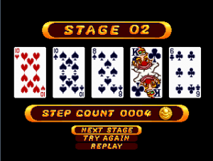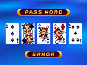 The entirety of Clown Planet is represented by 60 levels, divided into 6 worlds, with each level having a set of explosives to blow up and a password to give once the deed has been done. Like Bombuzal, and quite unlike many other PlayStation games around this time, The Bombing Islands does not support the Memory Card. Resuming requires inputting a password made up of four cards from the French 52-card playing deck; you’ll have to keep note of both suite and rank of each card when writing down passwords.