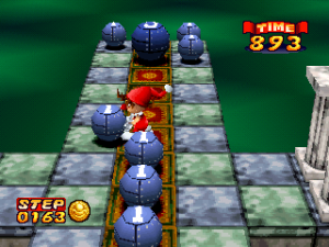 Kid’s fool errand isn’t as fraught with hazards and obstacles as what was present in Bombuzal, though there are a few new ones this time around. Slippery tiles and Dissolving tiles make a return appearance, as do the occasional immobile bomb. Mines are absent, though there are spiked beds that Kid Klown can walk into. These won’t kill him, but will instead make him jump up and forward, allowing him to hop over bombs and other obstacles taller than him. Spikes can also cause him to leap off of the stage, but this will only cause him to jump in the opposite direction, towards the stage. Trampolines replace the teleporter titles, and they now move Kid to another trampoline instead of an unmarked tile somewhere else in the stage. There are also bouncy tiles, like wobbly barrel cacti in the Desert stages or pinball bumpers in the Ruins stages (for some reason), that Kid can push bombs against, which will cause the bombs to rebound to the square behind Kid, squishing him in the process. This isn’t lethal either, and is often required to solve some of the puzzles.