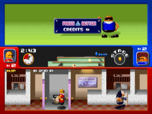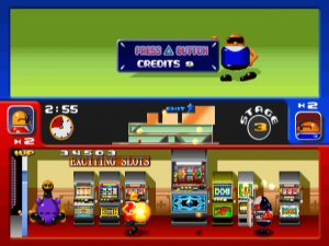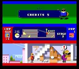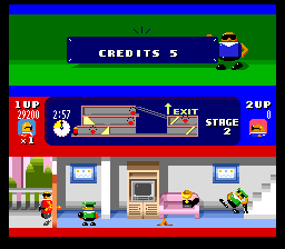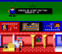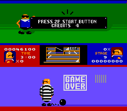 This is where the cooperative elements of Bonanza Bros. work best. Like Crack Down, the screen is divided into halves, with each player being to explore independently of the other. The stages are non-linear, making it a matter of having one character distract the guards while the other sneaks up from behind to take them down. You can also open doors to slam unsuspecting enemies, and a few stages have 10-ton weights you can activate to smash them into pancakes. A map screen in the center of the screen indicates the positions of both players, as well as the treasures, though not the enemies.