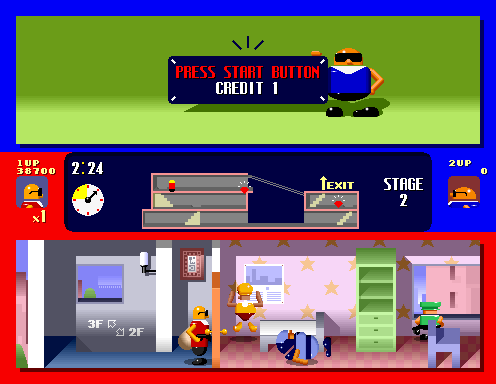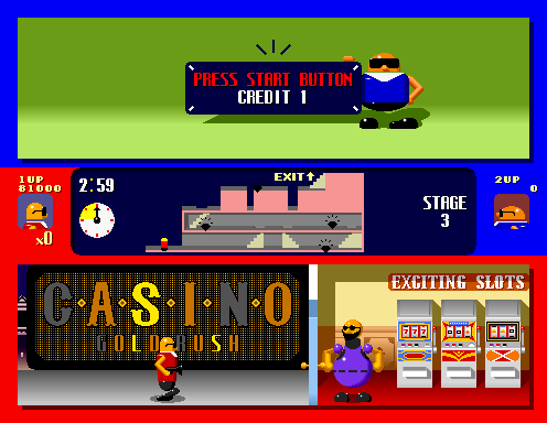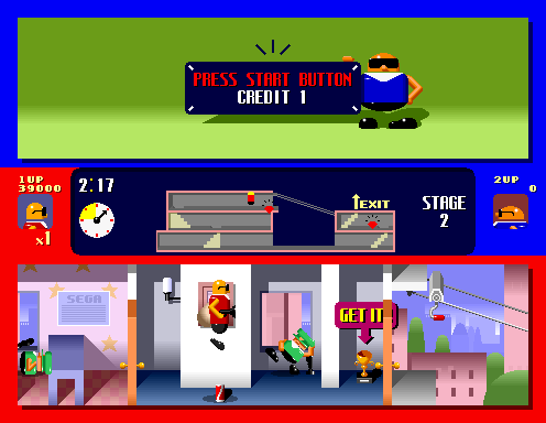 The Sega System 24 board seemed to be the go-to place for innovative, two-player cooperative games. Beyond Crack Down and Gain Ground, Sega released Bonanza Bros., a substantially goofy cops-and-robbers themed game. The main characters are Mobo and Robo (Mike and Spike in the Genesis release), a duo of thieves, although the scenario differs slightly between regions – in the Japanese version, they are sent to Badtown in order to break into assorted criminal organizations in order to find evidence, while in the English versions, they are testing out security systems for paying clients.Your goal is to infiltrate a small building, obtain all of the treasures, avoid detection by the guards, and escape, all under three minutes. Stages include museums, department stores, mints, antique shops, cruise liners, and at the end, a pyramid.