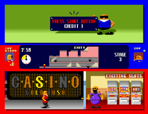 The Genesis version is, for the most part, a great port that looks and plays well, and even sounds a little bit nicer. Unfortunately, it’s missing two stages (for ten total, versus twelve of the arcade), as well as the bonus stages where you need to collect gold while dodging spotlights. The tutorial stage is also gone. However, as a bit of fan service, the art museum stage now features pictures from assorted Sega games. There are also small Pac-Man style story interludes after every few stages. The Genesis version also shows up on the Wii Virtual Console, on the Sega Genesis Collection for PS2 and PSP, Sonic’s Ultimate Genesis Collection for PS3 and Xbox 360, and as an unlockable bonus game in the Japanese version of Sonic Gems Collection. (It was removed from all other regions for reasons unknown.)