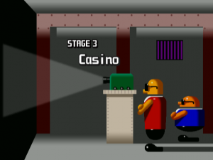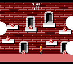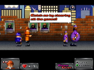 Unlike most stealth-themed games, retro or otherwise, Bonanza Bros. is viewed from a 2D side perspective. However, you can also duck in and out the scenery, in order to hide in alcoves and avoid detection. Although you are armed with a weapon, the rate of fire is slow, and the bullets only temporarily stun enemies. Many typical foes can be taken down easily even without hiding, but some require substantially more strategy. The most common are the guards with riot shields, which are invincible from forward attacks and must be shot from behind, but also tough are the bomb-lobbing guys, which require several hits to take down.
