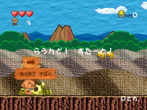 The controls have a couple of quirks that can get annoying. In order to reach most platforms, you need to make a walking jump, or else your leap won’t take you far enough. Whenever you land from a jump, there’s a split second that Bonk squats on the ground – you can still move, but you can’t jump until he gets back up, which makes jumping in succession a bit troublesome. The hit detection on the dive bomb attack is also a bit suspect, especially during boss fights – it might seem like you hit a vulnerable spot, but instead you end up taking damage. Considering how prolific the fruit power-ups are, however, this isn’t a gigantic problem.