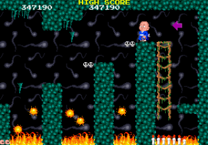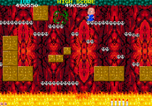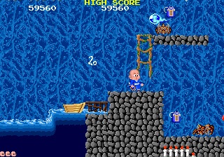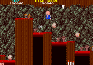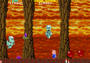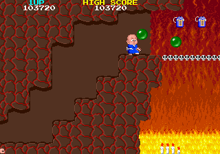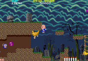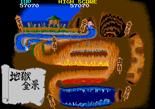 Drawing some clear inspiration from the Ghost n’ Goblins series, Taito’s Bonze Adventure is an arcade platformer that draws from Buddhism and Japanese lore. King Emma, the Japanese Buddhist lord of hell, has gone crazy and unleashed a horde of youkai, and it’s up to a Buddhist monk named Bonze Kackremboh (along with Tosenboh, in two-player mode) to defeat them. The cultural touchpoints are numerous throughout, making Bonze Adventure more than just another arcade platformer.