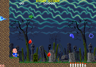 Our hero attacks with mala prayer beads, which are tossed at a long arc. The beads grow in size as you collect power ups of the same color until they are larger than Kackremboh himself. They ricochet off any surface they hit, just a single time before finding an enemy to damage or disappearing. When at full power, holding down and pressing the fire button will trigger a super move that varies depending on the color of the bead. A green bead creates a circle of smaller green projectiles that fire out from the center. The large red bead breaks into eight flames, firing four to the right and four to the left, destroying everything in its path. The purple bead is the strongest, creating a shot of lightning and eliminating all enemies on screen. You can find a few power-ups like extra prayer beads so you can fire multiple shots at once, and magatama beads to increase the number of times they can bounce. You can only take a single hit before dying, though you can find statues to absorb a single hit, while a series of burning candles acts as a timer.