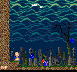 The early stages are beautifully designed, full of creative monsters like walking gravestones and flaming foxes, with the levels sometimes offering branching paths. The game starts in a dilapidated cemetery, then moves to the Sanzu River, the Japanese equivalent to the River Styx that separates the earthly realm from the afterlife. Then you descend further and further into hell, through levels of fie and ice. The fourth stage, Bloody Pond, is particularly creative as you are chased through hell by a grey haired fish with lazy eyes (hardly the weirdest creature you will see during your adventures), jumping across platforms made of arms and eyes that retract and extend into a river of blood. Bloody Pond is the only stage to feature no music, used to great effect. The only sounds being that of platforms squishing through wet blood. It’s effective, beautifully drawn and easily the best stage in the game. There are only two bosses, the first appearing in the third stage and the last (King Emma himself) taking two unique forms in the final battle.