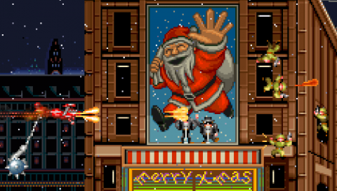 The “Merry Merry Christmas” stage is arguably the best of them all – the neon-lit streets full of strolling people are already very charming, as is the sweet medley of holiday tunes that makes the BGM, but the set-piece of the stage is what makes it special. The whole level is spent chasing a humongous drilling machine that constantly releases other vehicles. The heroes first follow the machine’s track under a bank vault, to reemerge in a baseball field (check out the puzzled players and umpires!), then again under the earth until the foundations of a hotel collapse on the machine, finally destroying it for good. The aviators climb the stairs of the hotel to breathe at last some fresh air… only to meet the real boss, a huge Santa Claus statue with an evil side and one of the hardest battles in the game. The novelty of the setting, coupled with the high level of detail and interactivity with the scenery, is what makes the level a joy to play, or just watch. It should be noted that every level has some degree of interactivity though, be it destructible elements or things that can be picked up and thrown around.