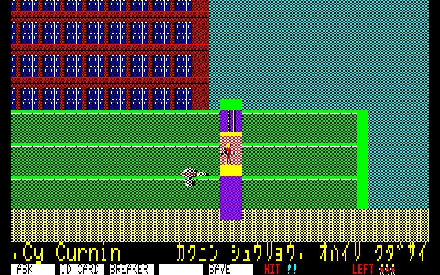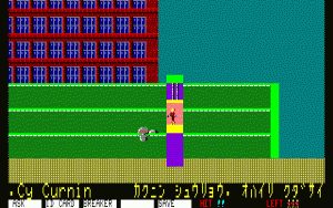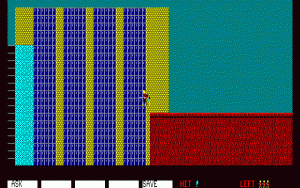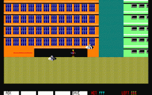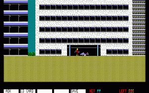Eventually you should find a green building with elevator far to the left, except you can’t reach the upper floors. Inside the building is a working jetpack you can take, and this allows access to a floating island high above this building. Reach the island you’ll find a red coca cola vending machine, but it’s seemingly useless. For some reason you can only remove the ID card from it if the emulator is set to KEYBOARD mode (joystick mode or anything else won’t work), and you need to press the Z button several times before it relinquishes the card. With this you can return to the green building, ride the elevator to the upper floor computer and use F1 and F2 to communicate with it. So brings about a lengthy conversation with the malevolent hardware which, proclaiming to be frightened, gives up its Brain Breaker weapon. Except when you try to leave it traps the elevator, lectures you, then promptly causes you to explode. The only solution is to use the Brain Breaker gun (F3) on the computer before riding the elevator, since it disables all electronic devices.