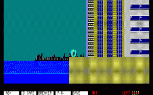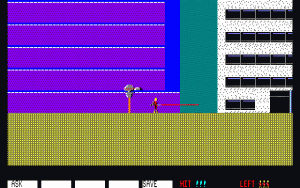 Upon your return to the city it seems the robots have been activated and are sent to kill you. There’s a jetpack on the ground which can be picked up, but doing so reveals it to be broken, and it proceeds to hurtle you up and down between the sky and ground. This is the first of many red herrings BB throws at you, since there will be several instances of broken items design to throw you off track in trying to escape the planet. Later on there’s a hover bike which soon after mounting explodes, killing you. There’s also a broken rocket launcher which can’t be picked up, and de-activated droids in strange places. Not many games from this era would use precious memory resources on red herrings like this, and so it makes for some interesting surprises.