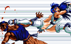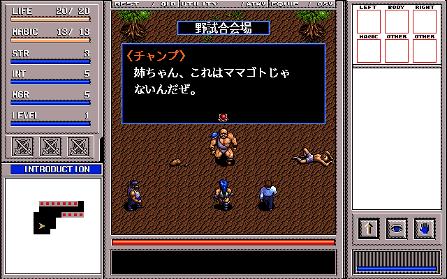 Umber is a tough wrestler and the champion of the arena in Brandish 2, upgraded to playable character in Brandish 3. Fitting with the fantasy tough girl stereotype, her judo thong reveals quite a bit of her (somewhat frightening) bodybuilder physique. She fights with knuckles, axes, boomerangs, and morning stars.