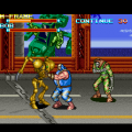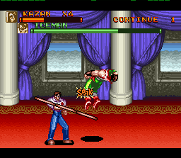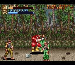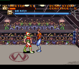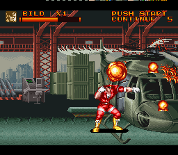 All five characters are available from the start, a good diverse roster for one player or two. Interestingly, even if playing solo, you still select a second character for reasons that don’t become apparent until you face any of the game’s bosses. Basically, the three characters that you do not choose are kidnapped by the terrorists and brainwashed, and in order to get them back to your side, you have to beat the snot out of them. Yep, your heroes are also the game’s bosses, with each “evil hero” having moves that you can’t normally perform (Bild spits fire, Wendy dives off of a rope and attempts to body splash you, etc.). This adds to a bit of replay value in addition to simply going through the game with all five characters, though you can switch to other characters (though only ones you’ve rescued) in between the four stages. Aye, there are merely four levels, which may not seem like much today, though there were only four levels in the original Double Dragon. That being said, these levels are actually pretty damn long and have an increasingly large amount of enemies with which to deal.