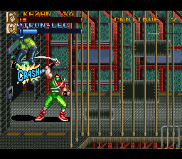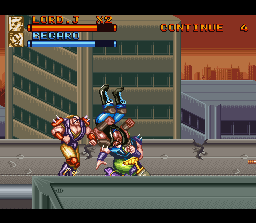 There’s a bit more creativity in enemies this time around, where baddies look less like street trash (as they did in Rival Turf!) and more like terrorists and/or cyborgs, like the masked pencilnecks who comprise cannon fodder. Common enemies which sport infrared goggles actually carry guns, which is odd considering how most brawlers tend to exclude firearms, though they’re usually slow and not too damaging. More obnoxious masked enemies tend to spam shoulder charges and sliding kicks, and these jerks who pilot powered armor (somewhat akin to the famous Power Loader in the final scene of Aliens) will grab and shake you for considerable damage. Large “Mongolian road warriors” are the most threatening enemy, though they thankfully don’t appear until halfway into the game. As with the first Rushing Beat, there could perhaps be a bit more enemy variety, but what’s there is challenging enough. The aforementioned “evil hero” bosses are fun (yet tough) fights set to a kickass boss tune. The final boss, Iceman, may look like a bit of a dork, but his lifebar is three times the size of the other bosses, he swings around a three-piece staff to remain nearly invincible, and when you break the staff, he spams roundhouse kicks and releases some sort of spirit projection ripped right out of Jojo’s Bizarre Adventure. In other words, a typically cheap final boss who takes a few lives to defeat.