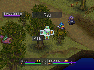 Another new implementation to Breath of Fire III‘s gameplay is the Dragon Gene System, which is the new method of Ryu’s transformations. Instead of just transforming into a dragon for a single round and using a powerful attack, Ryu can transform into a dragon and maintain dragon form, suffering a loss of MP each round until he no longer has enough to sustain the form. To do this, you must find Dragon Genes, DNA samples frozen in chrysm crystals spread throughout the world. When you open up the Dragon Gene window in battle, you can choose up to three genes to splice, and with about two dozen genes, it’ll take quite a bit of experimentation to discover the effects of all of the possible combinations.