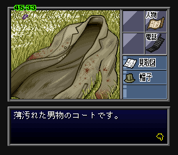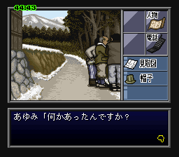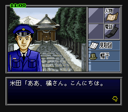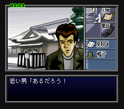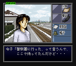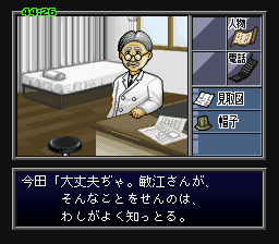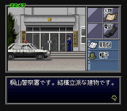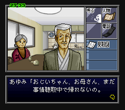 BS Tantei Club differs quite a bit from its predecessors due to it being a SoundLink game, and the benefits of the superior audio come at the cost of highly reduced interactivity. In order for the Satellaview to be able to pick up the satellite audio the game runs on a timer (displayed in the top corner). Each of the three parts of the game are about 60 minutes long, and in order to sync with the audio broadcast, the game will auto-advance to the next scene at designated times. Each scene typically starts with a fully voiced cutscene, followed by a limited period of gameplay where you can investigate the current scene to learn more details about the story (any dialogue encountered in this phase is non-voiced); this repeats for the full hour, at which the player need to start the next part to continue the story. This ultimately means that you can beat the game without giving it any input (i.e. watch it like a movie): just wait until the time is up in the current scene and the narrative will progress anyway.
