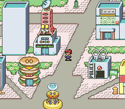 Super Famicom with Satellaview-add on and BS-X Cart. Screenshot: BS-X: Sore wa Namae o Nusumareta Machi no Monogatari hubworld