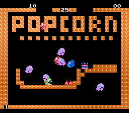 Bubble Bobble for the Game Boy features 200 levels total like the arcade, but the vast majority of them are brand new and unique to this port. While there are a few stages that are similar to the arcade versions, many of them have been tweaked slightly by adding new messages – such as the popcorn skillet stage now saying “POPCORN TIME” instead of just “POPCORN” – or adding new obstacles.
