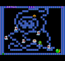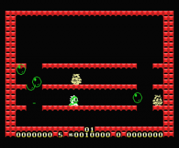 The final new additions to the game comes in the form of mid-bosses and additional stage layouts. Previously the only major boss was the giant Drunk enemy at the end of the game, yet Final Bubble Bobble adds brand new giant versions of the rock-throwing ghost monster Mighta and the fireball-vomiting Hidegon at certain points of the game. New stage layouts are also in the game, though they’re typically designed in the shapes of monsters or symbols.