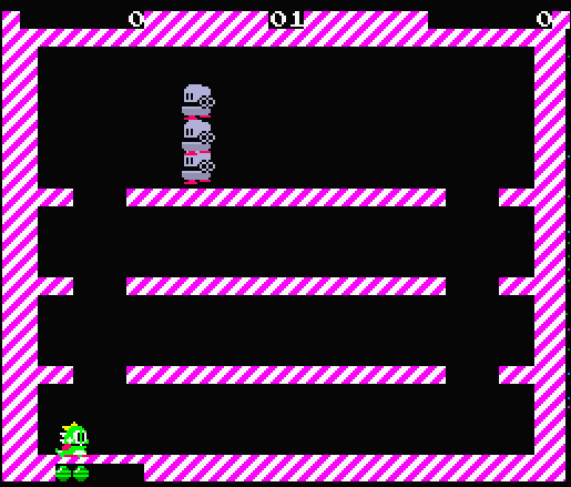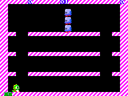 For the Spectrum ZX port, the most striking aspect of it is its graphics, which makes it look like Bub and Bob came out of a can of SpaghettiO’s. The color palette also tends to be pretty garish, and some levels even look like they’re covered in blood. Some may still find it cute in its own way, which is particularly important given that charm is an important part to the Bubble Bobble experience. The actual gameplay is largely preserved and items continue to appear through complicated means, though enemies tend to act differently than in other games. The stone-throwing Mighta enemies will rapidly fire projectiles when they see the player, compared to pausing a moment and only firing a single projectile. The Skel Monstas somewhat differently by sitting in one place longer than most versions and then suddenly lunging to a single point in a straight line faster than in other ports. This attack behavior makes them much more predictable and, as a result, easier to dodge. The ZX port has 80 levels, at which point it loops back to an earlier point in the game after defeating Super Drunk.