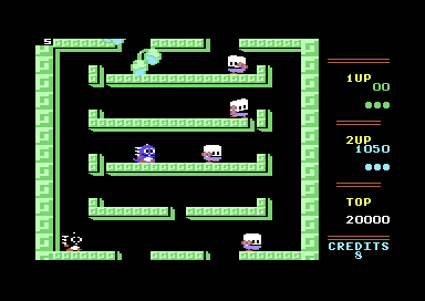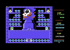 Bubble Bobble on the Commodore 64 is a remarkably solid port. It retains the usual method of popping bubbles through Bub and Bob’s fins and spines, the cryptic methods of obtaining items, and features 100 stages of the arcade original. Though there are some minor differences, such as the coded messages not appearing in the secret rooms, Commodore 64 players could play their version and have their experiences easily translate to the arcade version if they played it immediately afterward.