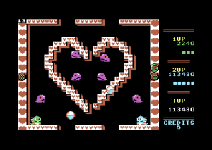 Among the early direct ports, the Amiga version is fairly close to being arcade-perfect. The graphics are nearly the same and the mechanics – from bubble jumping to kissing – also function the way that they should. The Amiga version also features all 100 levels of the original, compared to the 80 of the Spectrum’s version. The music is close to the arcade, though it also has a hefty dose of Amiga instrumentation that makes it stand out on its own. Overall anyone who became enamored with the arcade original could have picked up this port and felt right at home with its visuals and gameplay.
