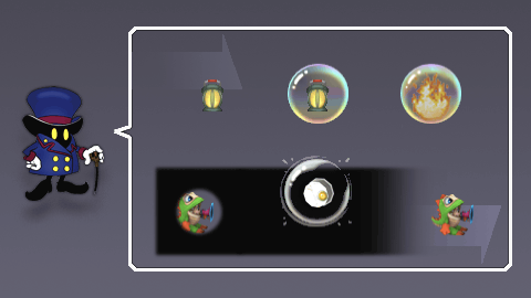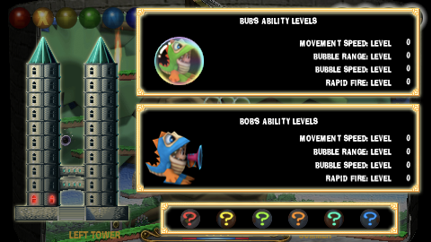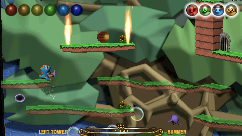 The only Bubble Bobble released for the PSP can best be described as vaguely Bubble Bobble-esque. In an effort to improve the classic formula, Evolution enables the player to control Bub and Bob – who are now children dressed up as bubble dragons blowing bubbles using trumpets – as they scale two separate towers simultaneously. Hitting the L button switches from one brother to the other, with each climbing their tower independently. In some cases what one brother does on their tower can affect the other, necessitating some coordination.