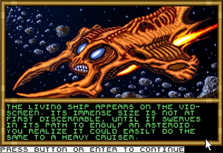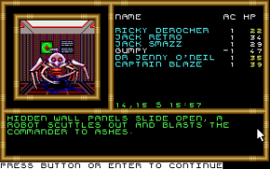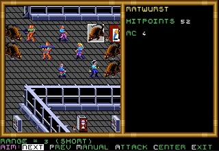 Despite being the first sci-fi title for SSI, the in-house developed engine Goldbox provides the backbone for the series, previously employed for Champions of Krynn and Secret of the Silver Blades. On the home computer versions, the player explores via a small window in first person view, while statistics fill the rest of the screen, like members’ status and available options selected via keyboard-friendly interface. The spare first person graphics work fine for standard size maps, but being left with no visual clues of any kind becomes problematic in larger areas.