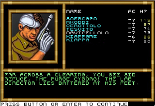 Countdown to Doomsday was the only RPG from SSI to receive – at the time – a direct conversion on a Sega console, published by Electronic Arts. The development team, led by Tony Van, went about slightly tinkering with the design, making it more approachable but, as a whole, not less unforgiving. The team now explores in third person view, through a bigger window: the player controls a single sprite representing the team. The RPG features a full soundtrack, as opposed to the couple of tunes that play occasionally on the home computer versions. Gone is, naturally, the Log Book, which would make little sense for a console audience; the events and encounters are fully described via in-game text, with some necessary minimal cuts. The character creation is simplified, featuring less races and character classes, along with less skills to choose from, keeping the basic ones for each character’s class. Overall, a pretty efficient design choice.