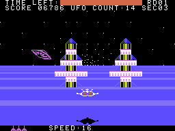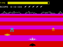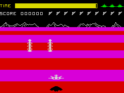 U.S. Gold brought the C64 game to Europe, and also commissioned a Spectrum port for the UK. It turns out the horrible scrolling of the hardware also translates to pseudo-3D games, making the planet surface appear to just swap the two ground colors rather than scrolling them – definitely not recommended for epileptics.
