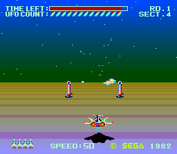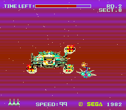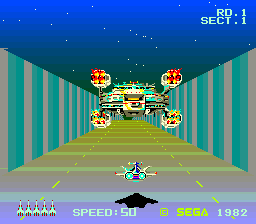 Sega had first explored sprite-scaling 3D the year before with the racing game Turbo, and Zoom 909 followed as the foundation for the second mainstay of their sprite scaler games, third person rail shooters. The player took a seat in a futuristic space ship – preferably actually sitting inside the comfy cockpit cabinet – to hunt down an alien mother ship through six stages. After the initial run through the presumed Death Star trench follows a flight through outer space, a variant of the trench with approaching walls to dodge, a swoop over a planet surface with strange pillar gates to pass, a mine field where the mines and enemies are invisible most of the time, and finally the decisive battle against the mother ship.