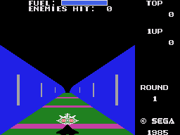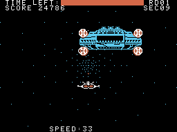 Even though the SG-1000 was released in 1983, Sega had been rather slow at supplying it with a decent software library, and thus Sega of Japan’s only home port of Zoom 909 didn’t come out before 1985. It wasn’t as good as Coleco’s versions, but at least it had the trench stage in both its variations, a plain planet surface stage, and the authentic boss battle.