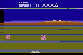 The Atari 2600 version is a bit different from the rest, as there is no flying height and no transitions between the ground phases, of which there are only two. This makes the game feel very fast-paced compared to the other ports. The saucers in outer space also always fly in formation, and the boss consists of just two parts that keep retreating into the background and then flying at the player with rapid speed. The Texas Instruments one also has only two ground phases, and the first just has the gates to fly through, while the second is exclusively for shooting Space Hoppers, as the gates do nothing.