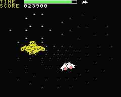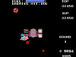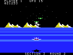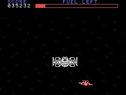 In place of the time limit system from the arcade, the home versions use a limited fuel supply: If the ship runs out of fuel, you get sent back to the very beginning of the loop. The ship is only ever refueled after defeating the mother ship, so this can get quite frustrating. The controls are also a bit weird, because the speed can only be changed by pressing Up or Down after the ship is at maximum/minimum height. Worse than all that, though, the action just isn’t that exciting without the speed and the flash of the arcade machine.